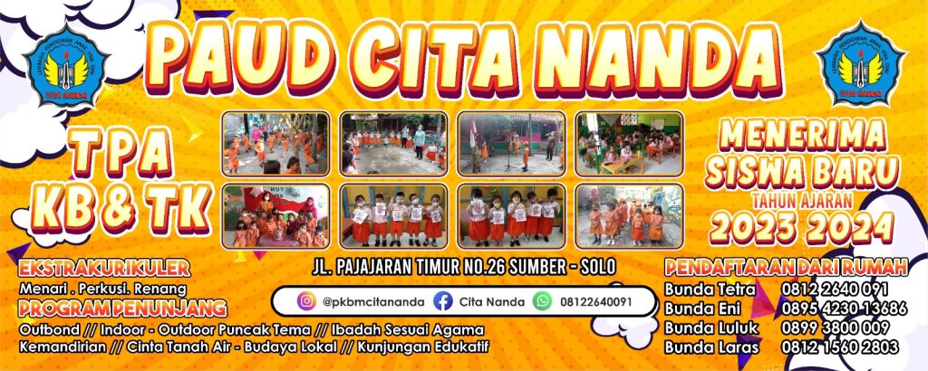 Cita Nanda sudah membuka pendaftaran untuk penerimaan siswa baru tahun ajaran 2023/2024. Untuk pendaftaran dapat dilakukan secara langsung, maupun lewat nomor kontak yang telah tersedia. Terima kasih atas kepercayaannya pada PAUD Cita Nanda.
